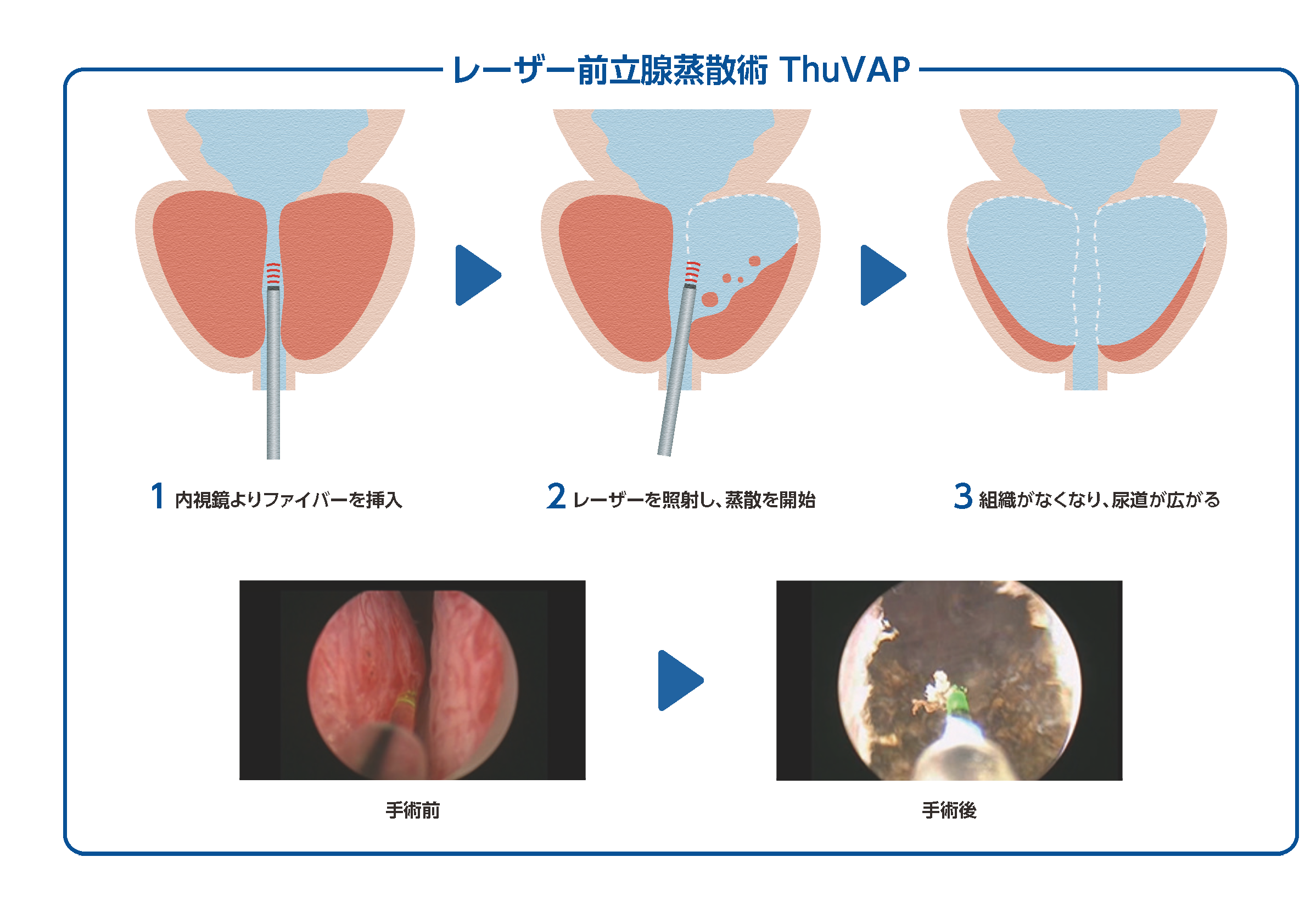 このレーザ治療は前立腺に対し従来から行われている一般的な手術療法・経尿道的前立腺切除術(TUR-P)やPVPレーザ治療に比べ、身体への負担が少ないだけでなく治療時間の短縮、出血の少なさなどヨーロッパ泌尿器科ガイドラインにて認められている画期的な治療方法です。