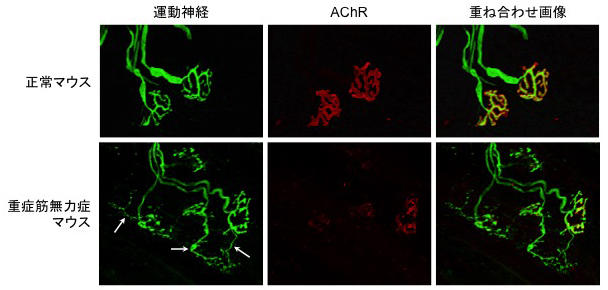 重症筋無力症を発症すると、AChRの凝集形が崩れ、神経のスプラウティング (矢印部分) が生じる