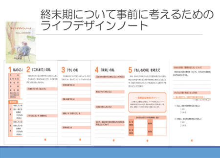 では、どのくらいの人が終末期について考えたり、人に伝えたりしているのでしょうか。私たちは、当センターの外来患者さんにご協力いただき、終末期を想定した場合にどのような医療やケアを受けたいか、ご家族と話したことがあるか、記録に残したことがあるか、を調査しました3)。ご家族や友人と話したことがある人は44%、記録に残している人は12%でした(図1)。調査の後、私たちは終末期のことを記録として残してくれる人をもっと増やしたいと考えて、ライフデザインノート(図2)を作成、配布し、そのノートに書いてもらう研究を行いました。そして、ノートに書くという作業がどのような経験になったのか、参加者にインタビュー調査を行いました。