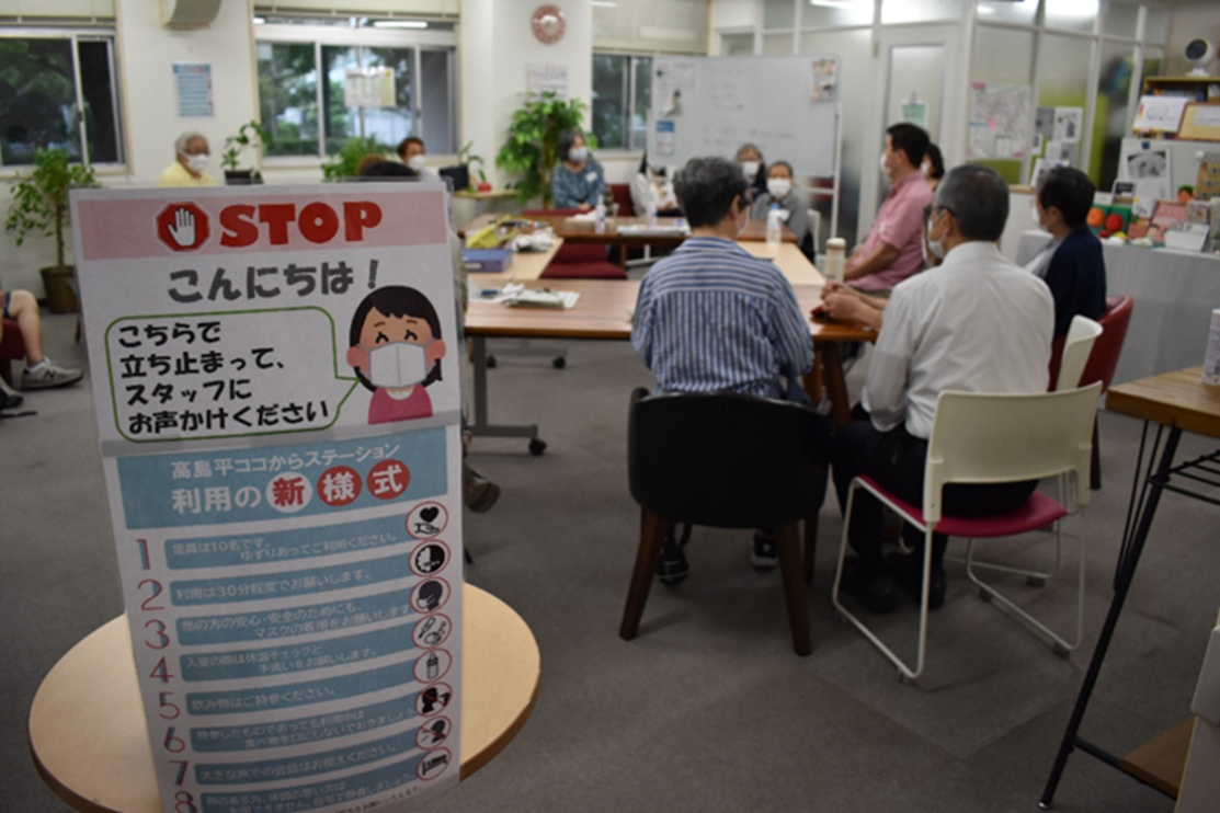 コロナ禍での地域拠点の活動内容については、緊急事態宣言を受けて一時閉室を余儀なくされましたが、直接支援ができない中で認知症の人やその家族、拠点の利用者を孤立状態にさせないことを目的とした取り組みを実施しました。拠点利用者や支援対象者への情報提供や交流を目的とした「ココから通信」の発行と郵送、電話を用いた保健師らの支援、地域連携の強化とICTを活用したオンライン会議の実施などを課題として取り組んでいます。拠点の再開にあたっては拠点利用の新様式や運営のガイドラインを作成しました。再開後は、コーヒー提供などの飲食の禁止などを行い、フィジカル・ディスタンスを確保しながら居場所としての機能を確保しています。また、感染症予防対策を行いながらの囲碁の実施や参加型アートプログラムなど新規のアクティビティ取り組みを開始するなど様々な工夫を行っています。また、月1回の認知症本人ミーテング「ココから話そう会」を継続し、各回10名程度の参加がありました。認知症当事者との協働として、主体的に認知症を学ぶ「認知症ゼミナール」も実施しています。高島平ココからステーションについてさらに詳しく知りたい方はFacebookページ(https://www.facebook.com/t.cocokara.st/)も開設しておりますのでご覧ください。