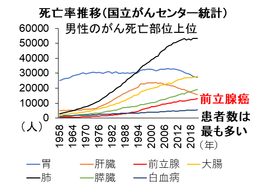 現在の日本で注意が必要ながんは何でしょうか?胃がんはがんによる死因のトップでしたが、診断、治療法の進歩で患者数、死亡者も減少傾向です。また肝臓がんについても減少しています。代わって男性のかかるがんとして最も患者数が多いのは前立腺がんです(図1)。特に高齢の男性に発症する割合が高く高齢男性に要注意の病気と考えられます。幸い検診で発見可能で早期に診断されると救命される可能性も高いですが、患者数の急増や進行した状態で見つかることも多いため死亡者も急増しています。死者数の多い肺がん、大腸がん、膵臓がんと並んで男性が注意すべきがんと言えます。