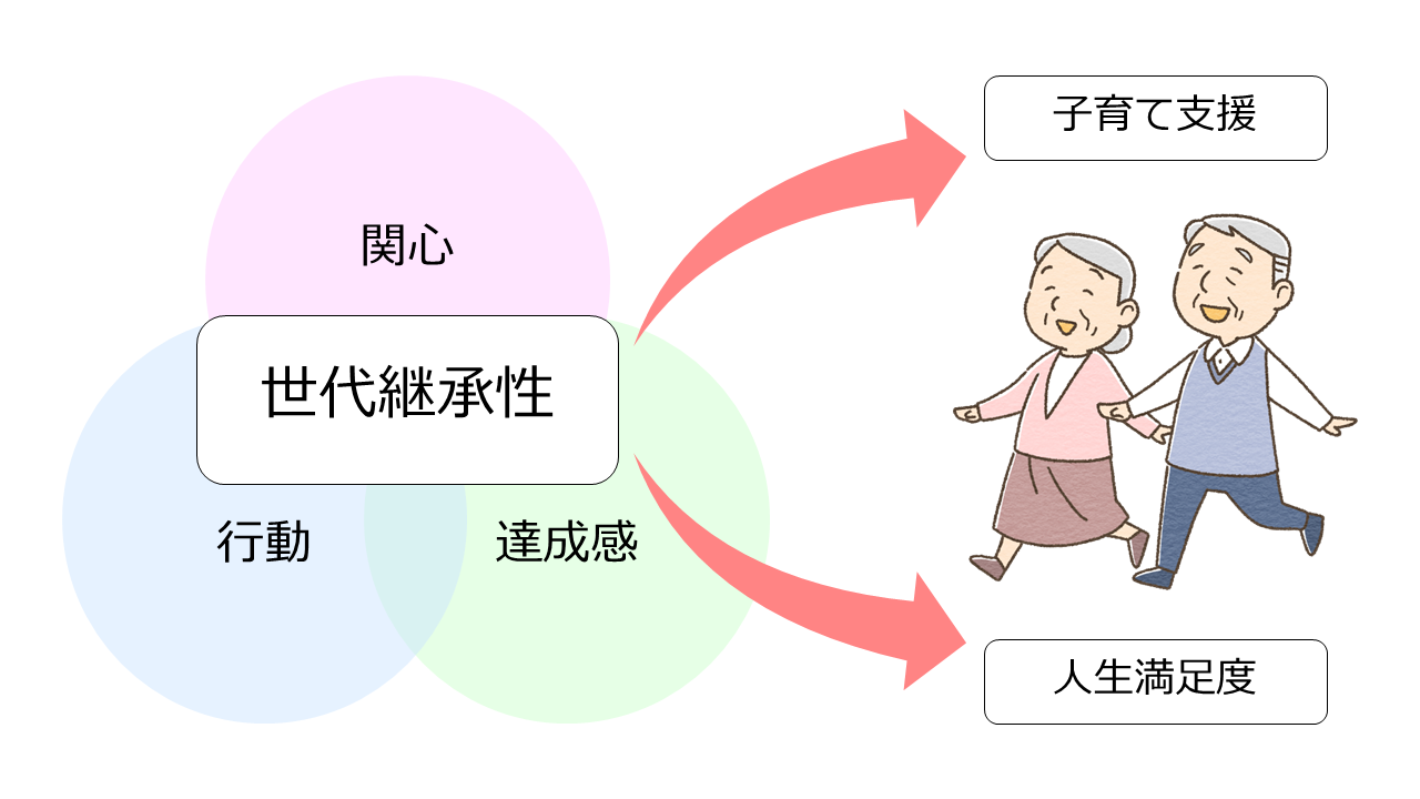 高齢者による若い世代への経験や知識の継承について、ここでは世代継承性 (generativity) という概念に着目します。これは、若い世代との関わりや創造的な行為に対する関心を表す「世代継承的関心」、自身の経験の伝達や助言といった具体的な行動を表す「世代継承的行動」、社会貢献や若い世代への継承に携わっていることへの実感を表す「世代継承的達成感」の3つから成るものです (文献1)。