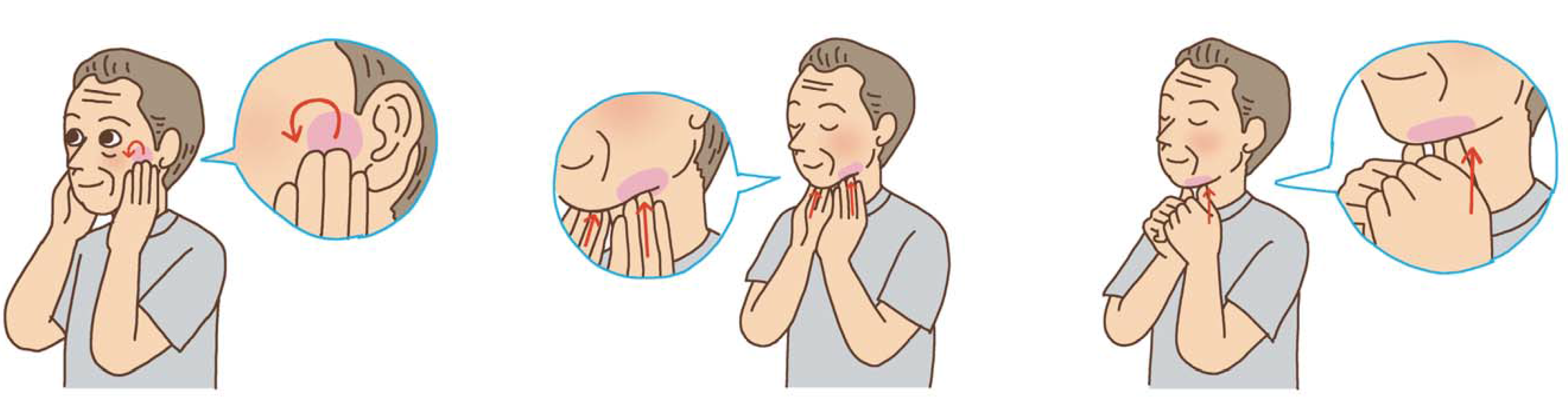各箇所、1 回につき5 秒程度を目安にやさしくマッサージしましょう(図9)。3 回ずつ繰り返します。まずは、耳下腺のマッサージです。耳の少し前くらいの位置を指(人差し指~薬指全体)でやさしく、奥から手前に向かって円を描くようにマッサージします。続いて、顎下腺のマッサージです。下の顎の骨の内側(首に近いところ)を指(人差し指~薬指の指先)でやさしく、耳の方から顎先に向かって、軽く押してマッサージします。最後に、舌下腺のマッサージです。顎先の少し内側(舌の付け根のあたり)を親指でやさしく、舌を押し上げるようにマッサージします。